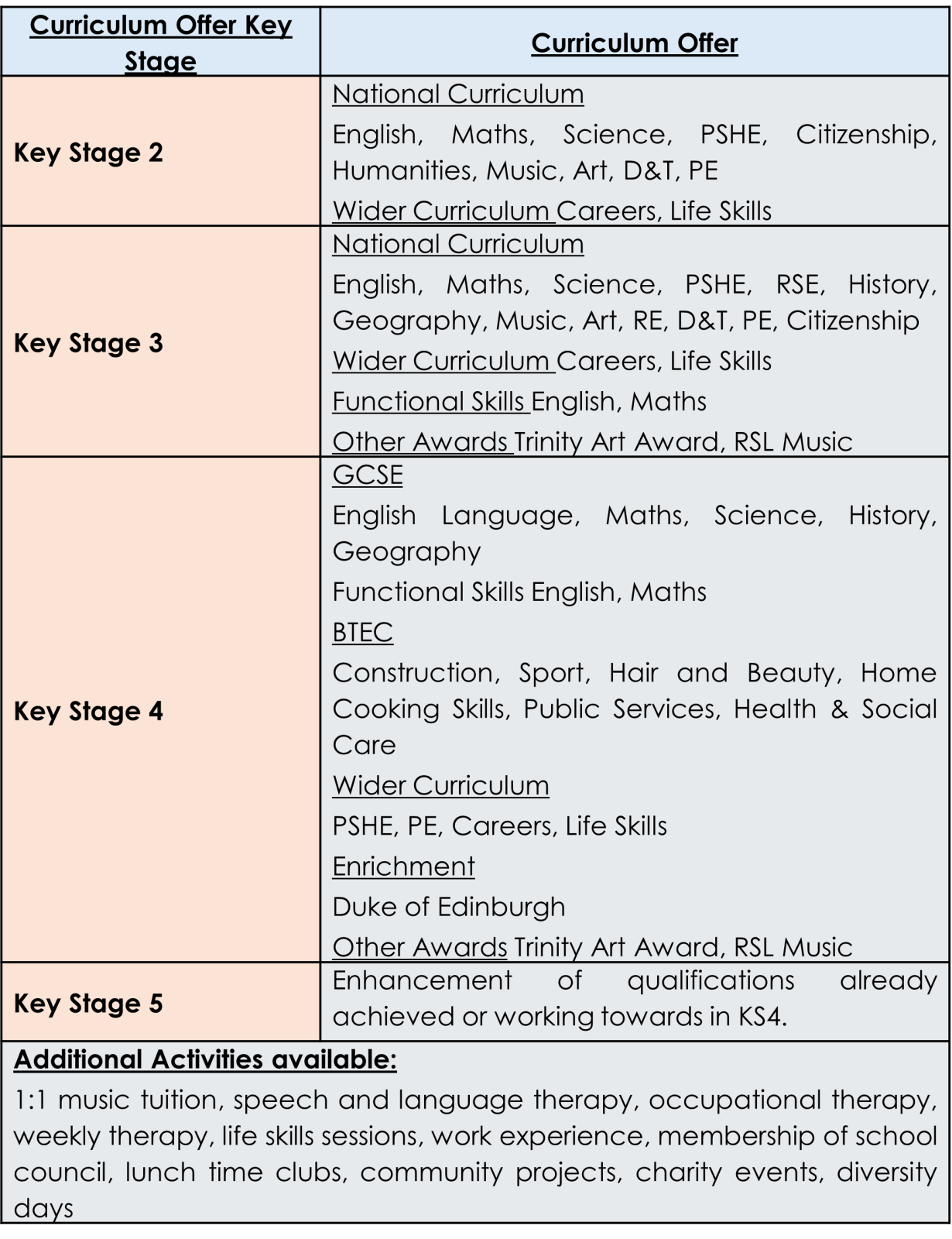 We offer a flexible curriculum providing both choice and challenge, focused on developing emotional literacy, core subject knowledge and offering a wide range of accredited outcomes.